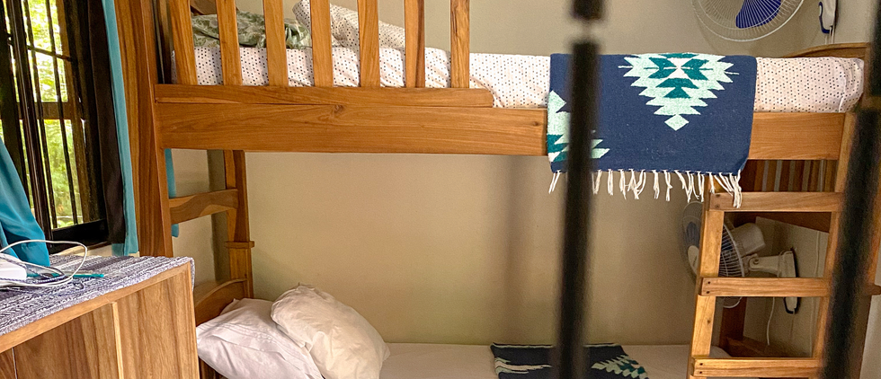 Playgrounds Surf Shack features a large, screened-in porch—the perfect spot for a nap between sessions or to unwind after a full day of surfing on our large sectional sofa. We have a beautiful outdoor shower with perfect-temperature water straight from our well, as well as an indoor bathroom with a shower. The master bedroom features a full-size bed and an en-suite bathroom, while the bunk beds are located in the main area, where we’ve installed a divider for a more private feel. Each bed also has its own fan to keep you cool.